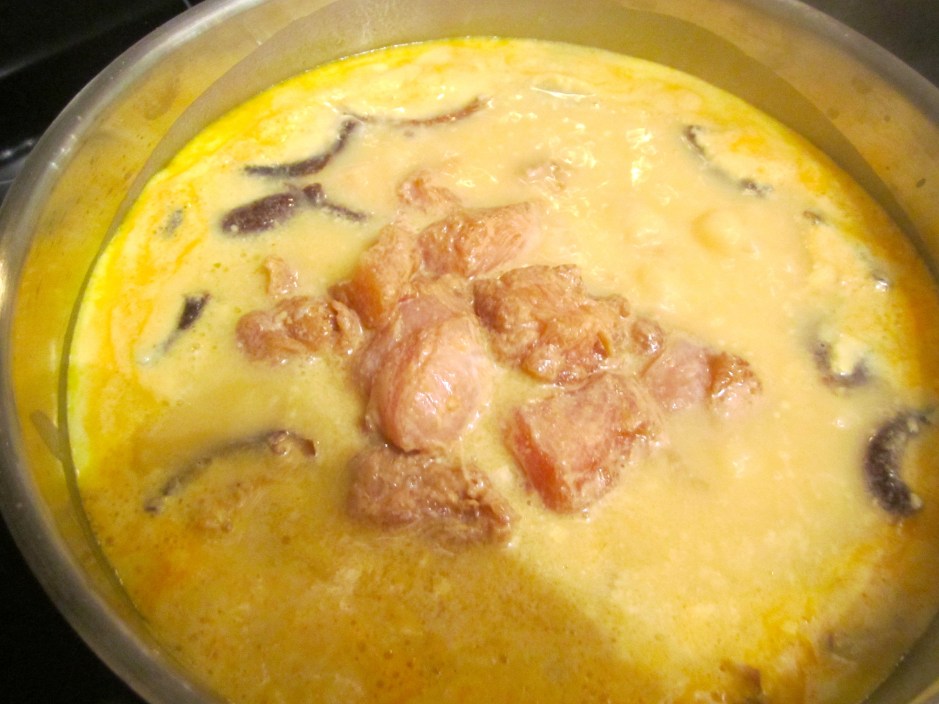 5 ← Previous Next → add fresh shiitake mushrooms and chicken to simmering stock, simmer for three more minutes