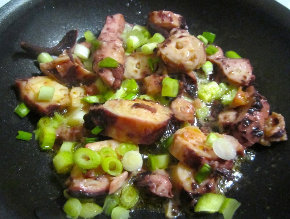 9 ← Previous Next → season drained octopus pieces with kosher with garlic paste, salt and cayenne pepper, saute in olive oil until heated, add finely sliced scallion
