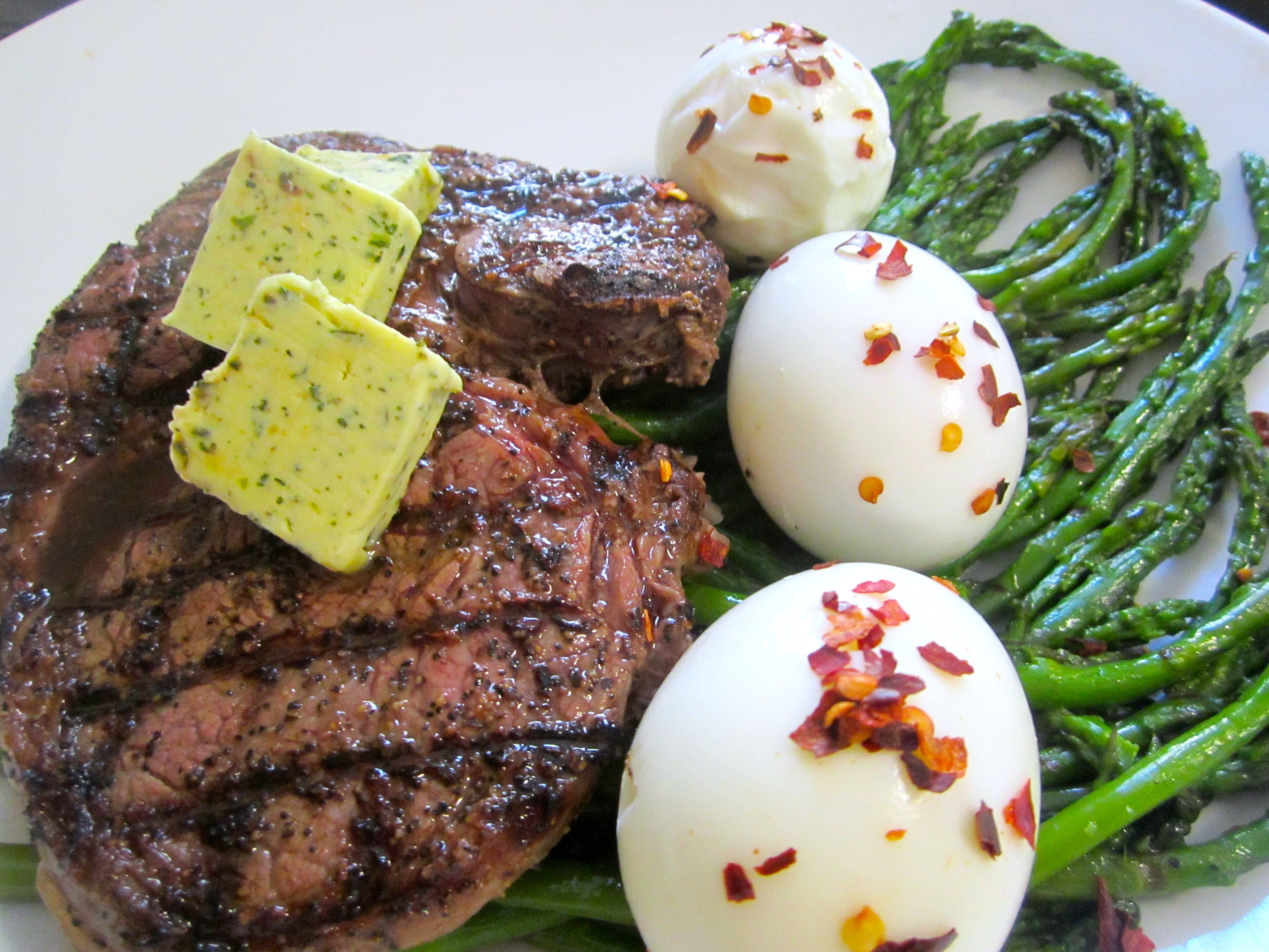 top with hard boiled eggs and herb butter