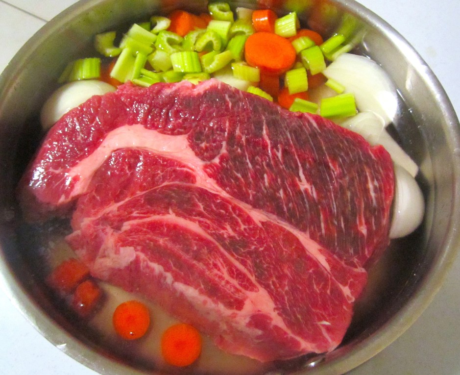 1 ← Previous Next → beef chuck roast or other braising cut root vegetables, water, bring to a simmer, cook until meat is tender, remove meat, set meat aside