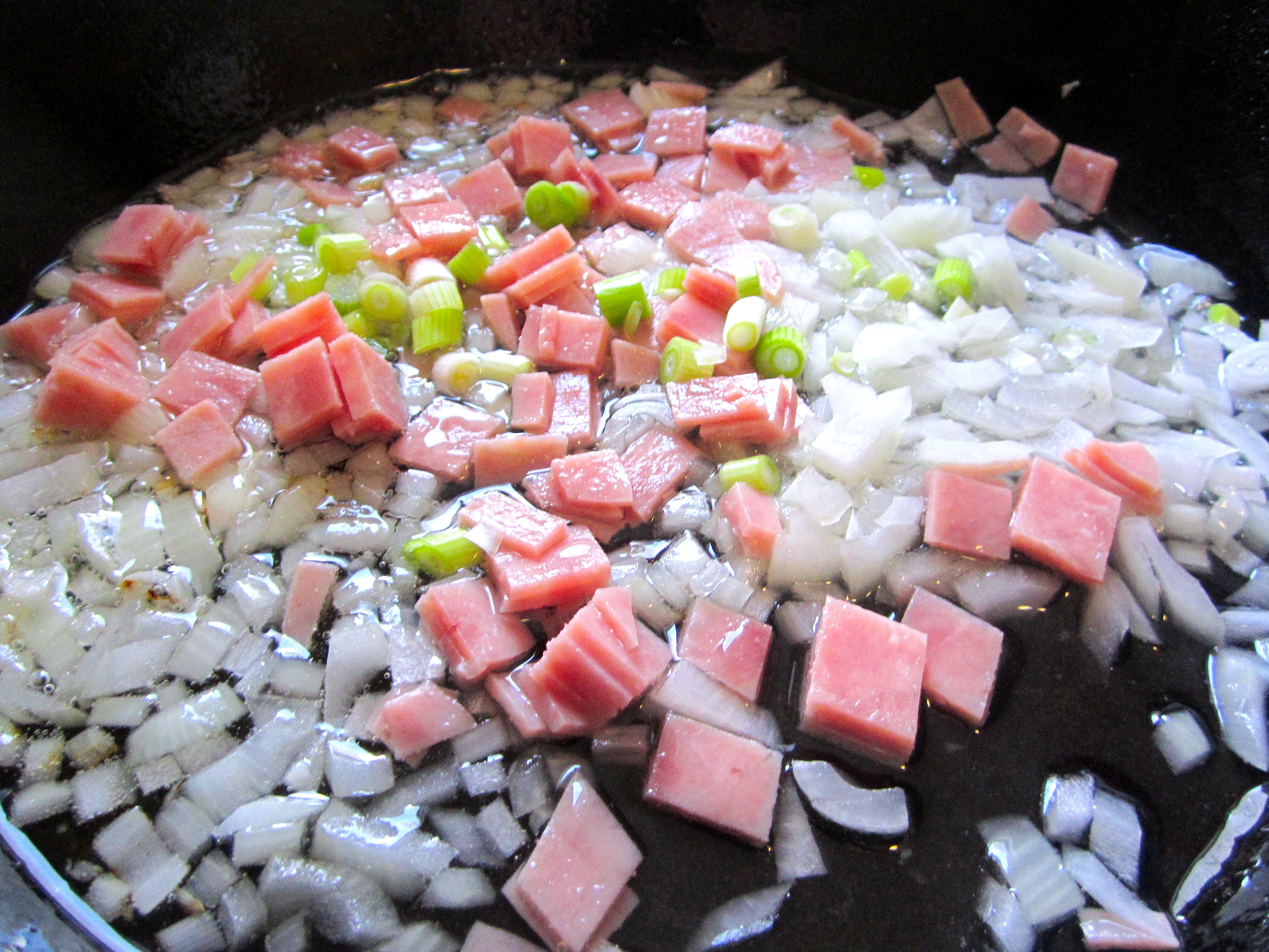 1 Next → saute onions, scallions, garlic paste (lot’s of it)and ham in olive oil (replace the ham with mushrooms for a vegetarian version)