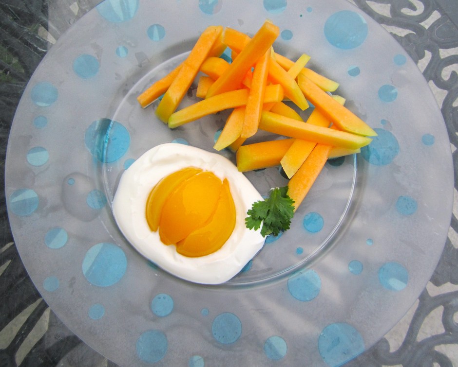 Fried eggs sunny side up & fries – yogurt, peaches and cantaloupe melon. Have fun 🙂