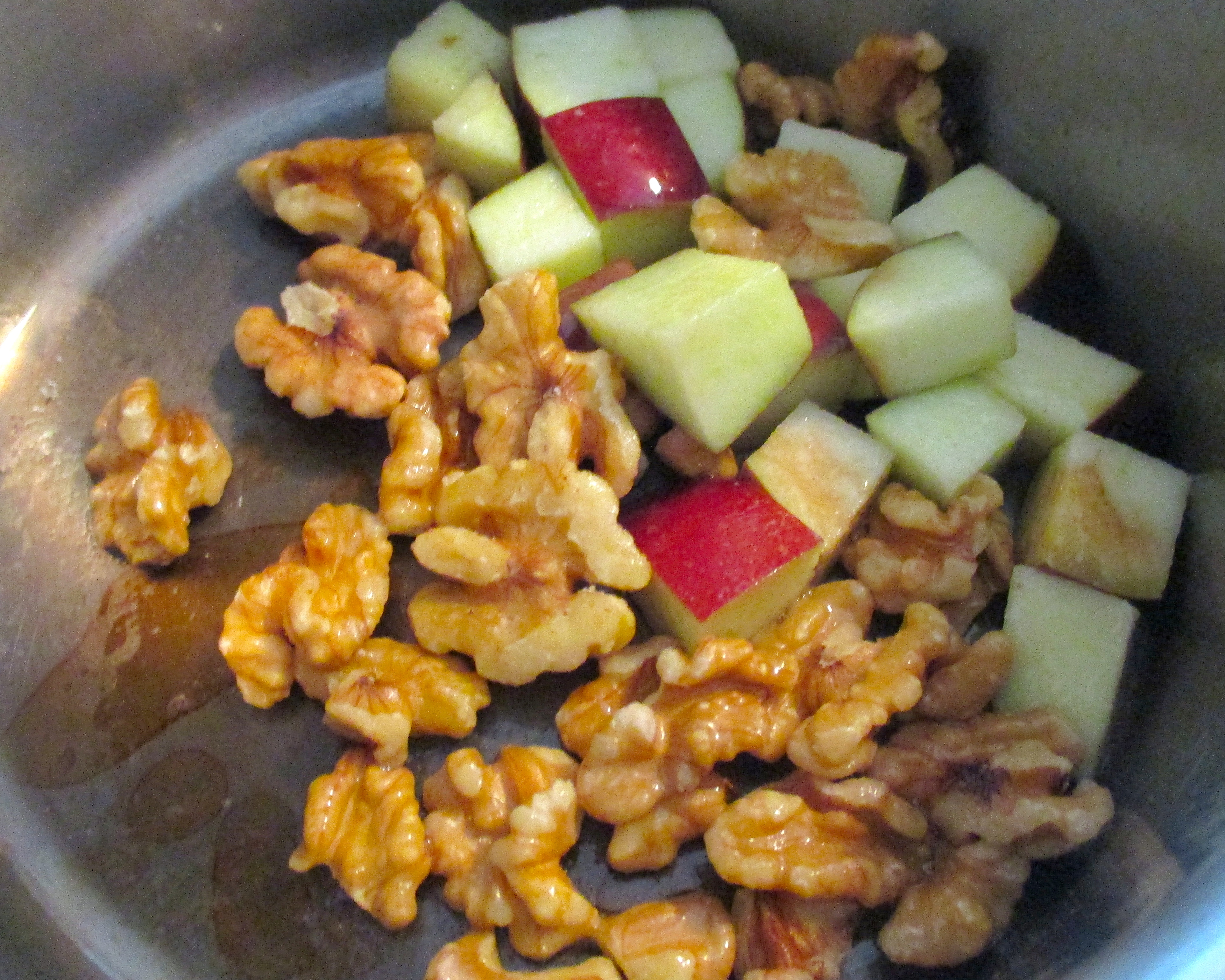 saute diced apples and walnuts in clarified butter until lightly caramelized