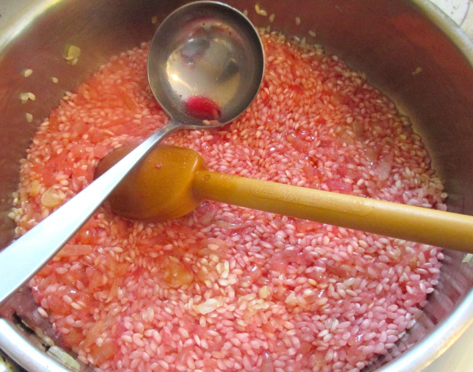 6 ← Previous Next → add beet stock to the rice, enough to just cover, stir constantly, keep adding beet stock as it is being absorbed by the rice, constantly stirring