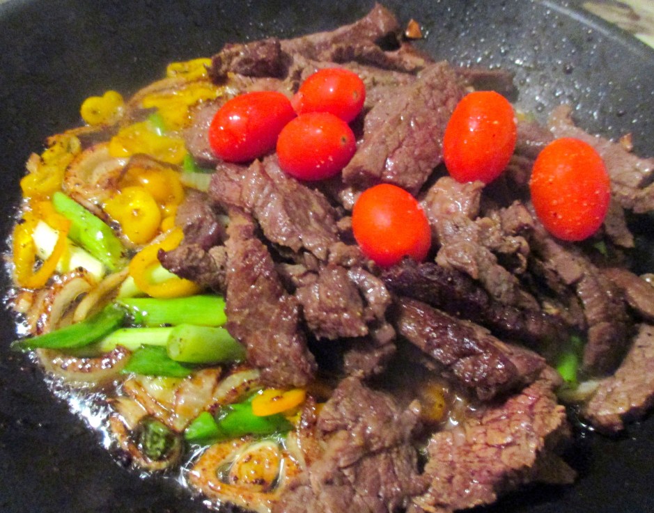 sauteed skirt and vegetables ← Previous Next → add grape tomatoes, saute until tomatoes are heated through, add skirt, remove from pan