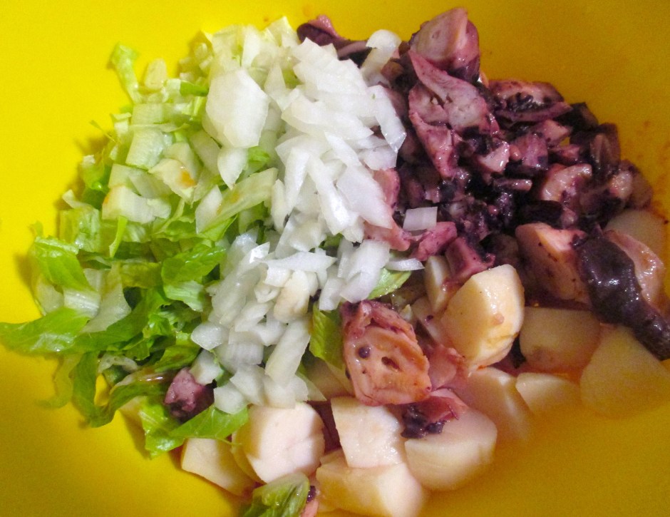canned octopus ← Previous Next → marinated octopus, diced onions, boiled cubed potatoes, sliced romaine, garlic/lime vinaigrette