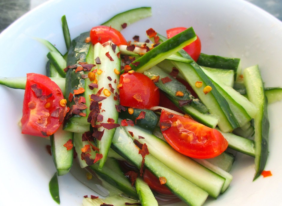 cucumber and tomato salad in lime vinaigrette ← Previous Next → mix cucumber and grape tomatoes with chili flakes, kosher salt, olive oil, garlic paste and lime juice