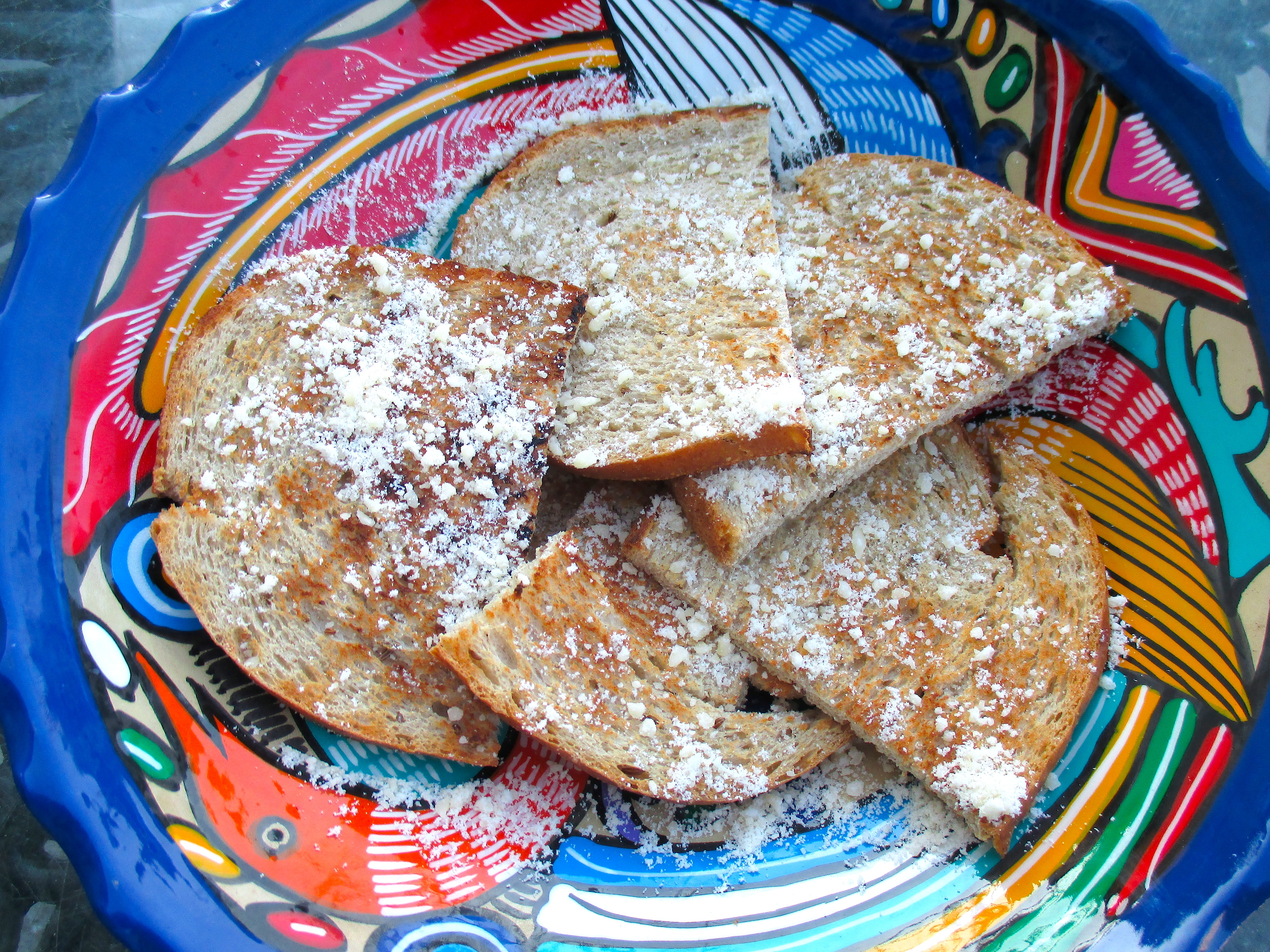 add bread slices to serving bowl, sprinkle with grated parmesan