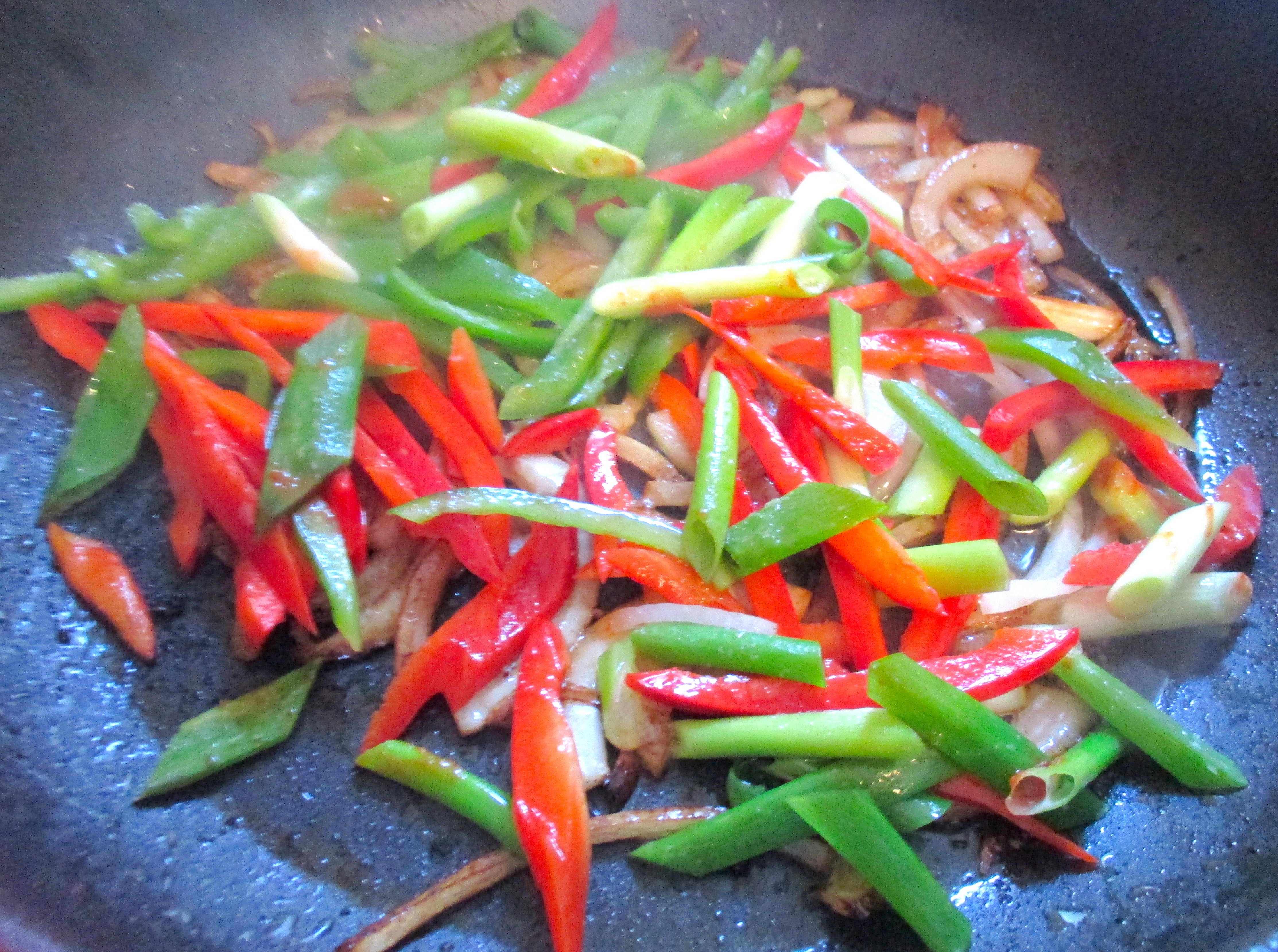 saute peppers ← Previous Next → add sliced peppers and scallion sticks, season with one table spoon garam masala and one table spoon curry powder, add half cup of heavy cream, simmer one minute
