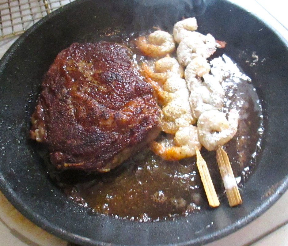 Surf & Turf Next → season rib eye and shrimp with kosher salt and fresh grated black pepper, saute in garlic oil, meanwhile dress romaine with raspberry vinaigrette
