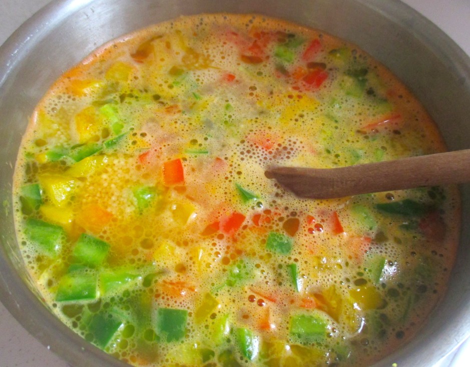 coucous ← Previous Next → add diced bell peppers and couscous, stir, cover, remove from heat, set aside, after 10 minutes, fluff with a fork