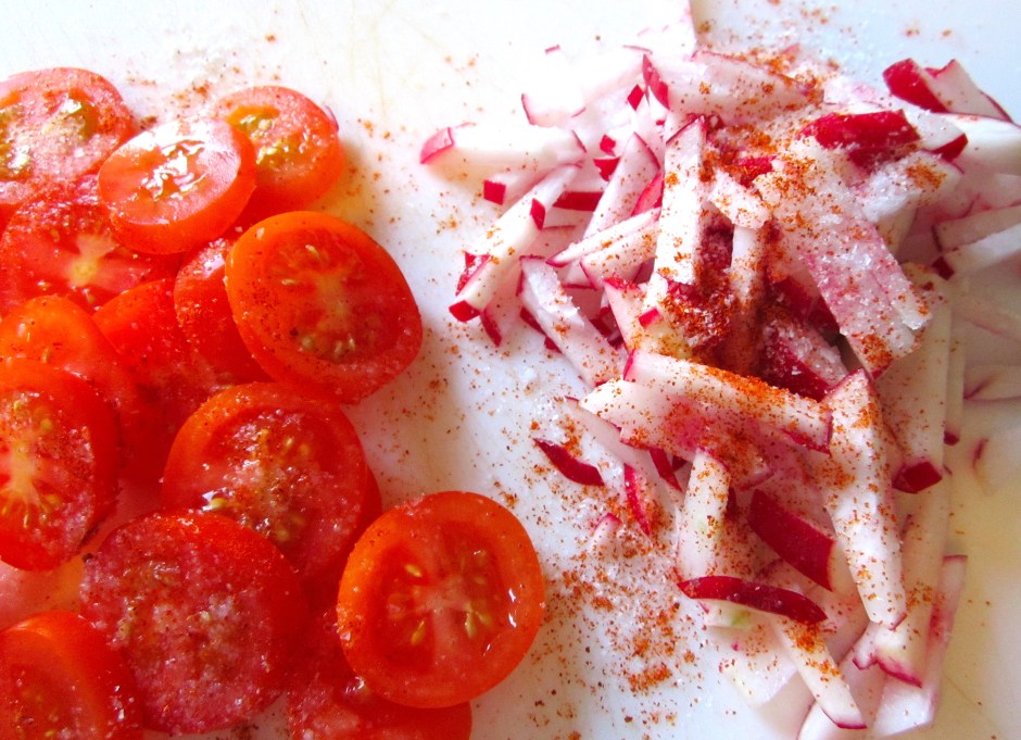 slice tomamto and radish, season with kosher salt and cayenne pepper