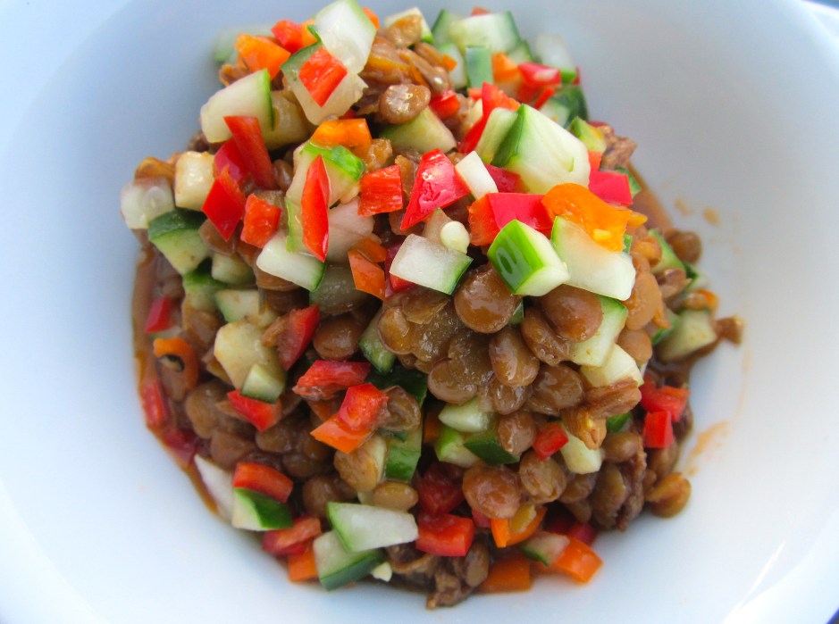 lentil salad ← Previous Next → cooked lentils, cider vinegar, olive oil, garlic paste, ketchup, dijon mustard, chilies, peppers