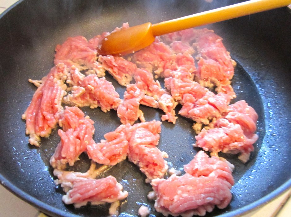 season ground pork with five spice powder, salt and black pepper, saute in peanut oil