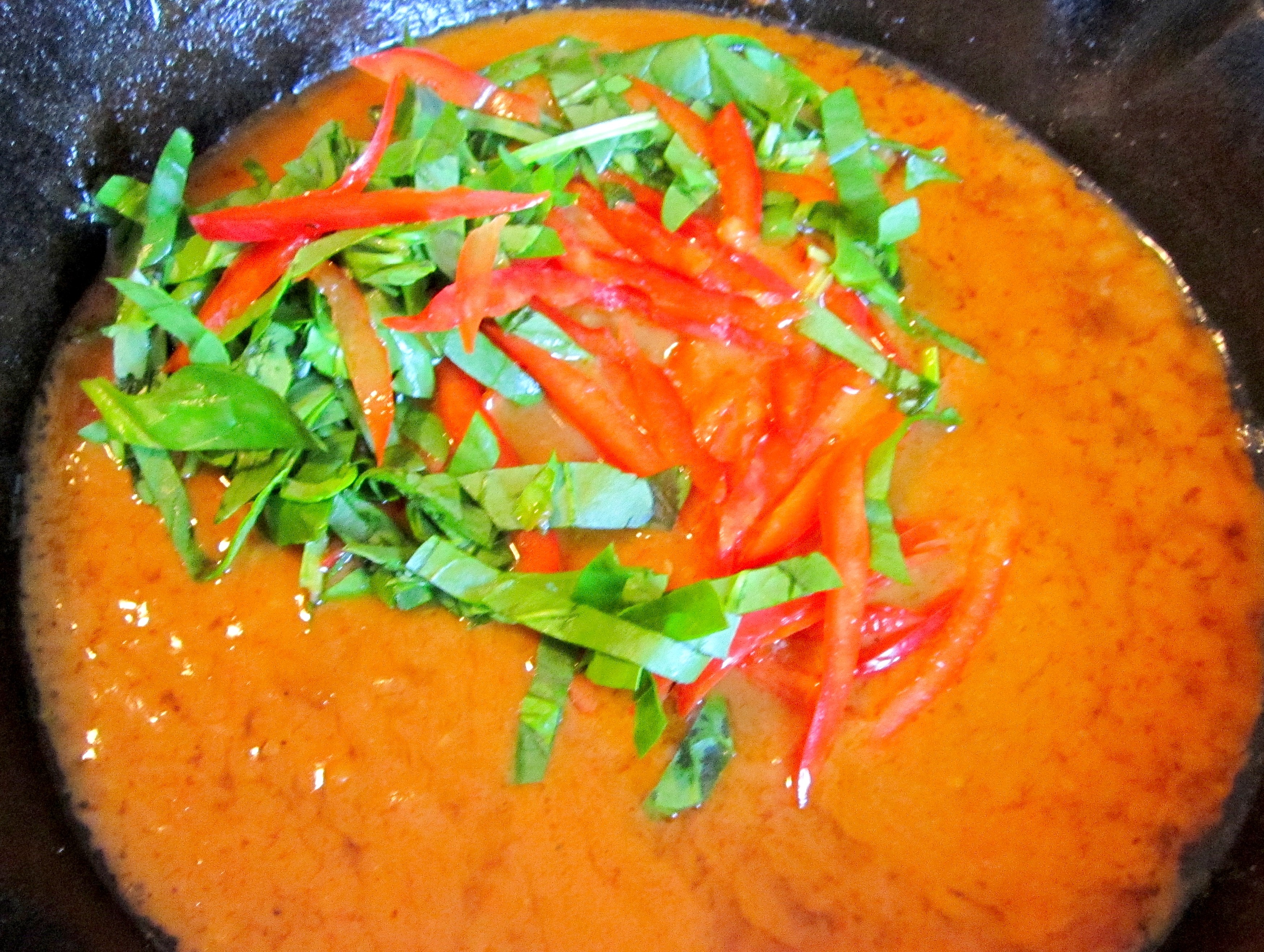 Bone-In Rib Eye & Pasta In Peanut Sauce ← Previous Next → add raw spinach and VERY finely sliced red peppers, remove from heat, check/adjust taste