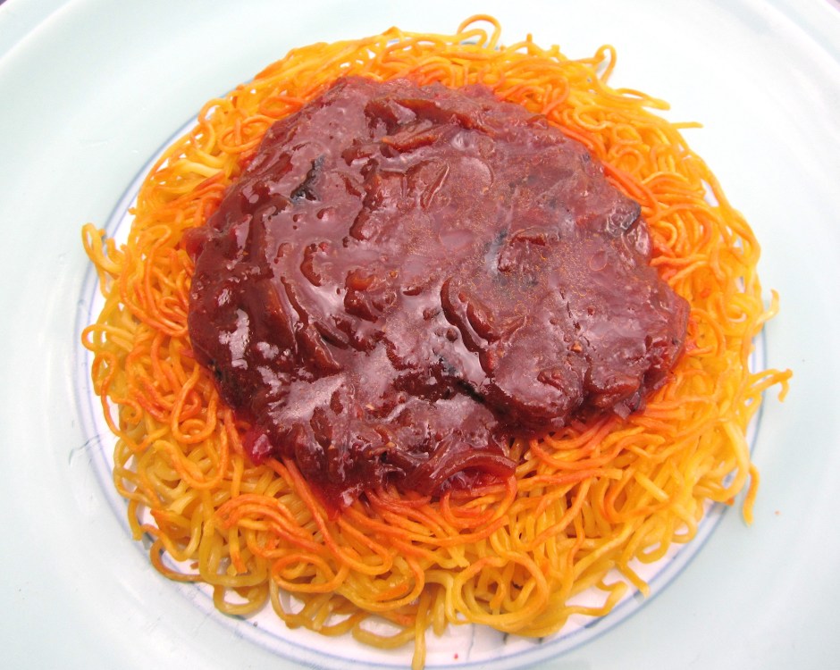 Crispy Fried Noodle Pillow With Braised Pork Belly In Oyster Sauce ← Previous Next → top noodles with generous amount of onion/sauce