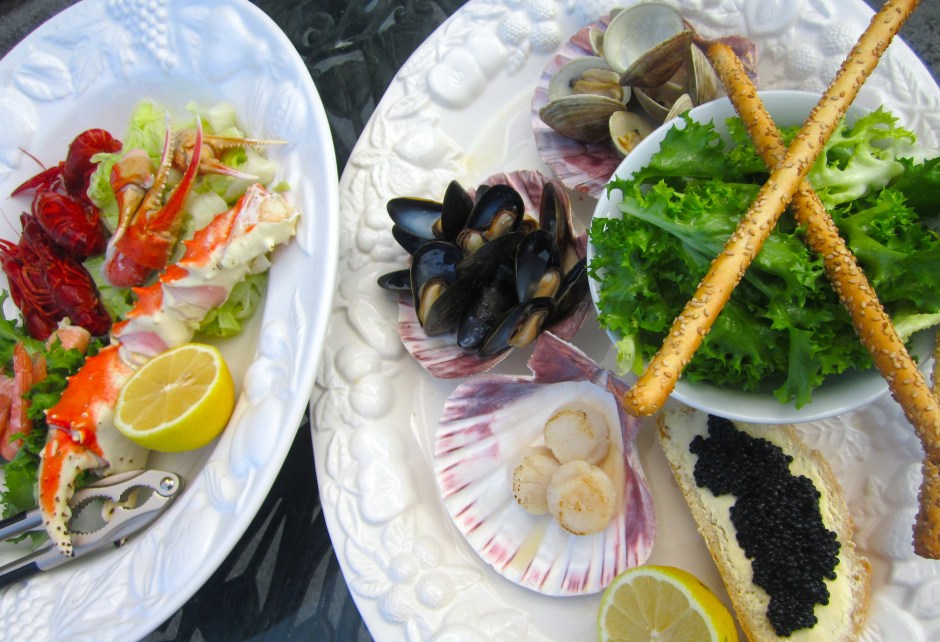 Seafood Salad Next → Seafood Salad – lettuce in lime vinaigrette, endive in lime vinaigrette, grissini, lemon, caviar on sour dough bread, mussels, clams, shrimp. king crab, snow crab, crayfish, scallops