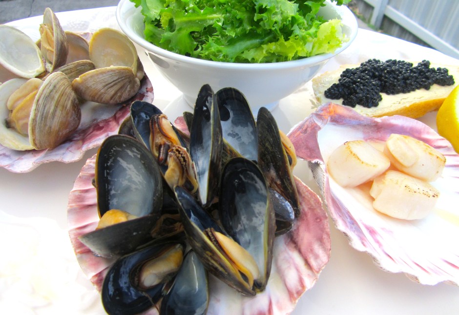 steamed mussels ← Previous Next → Seafood Salad – lettuce in lime vinaigrette, endive in lime vinaigrette, grissini, lemon, caviar on sour dough bread, mussels, clams, shrimp. king crab, snow crab, crayfish, scallops