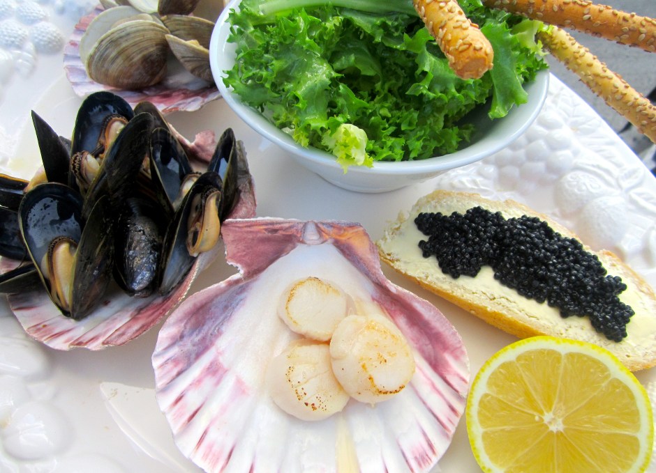Seafood Salad – lettuce in lime vinaigrette, endive in lime vinaigrette, grissini, lemon, caviar on sour dough bread, mussels, clams, shrimp. king crab, snow crab, crayfish, scallops ← Previous Next → dress endive and iceberg with vinaiggrette, butter sour dough bread with unsalted butter, top with caviar