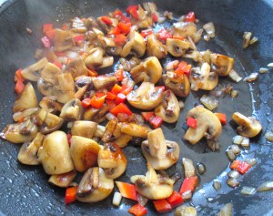 - in same pan, saute onions and mushrooms until starting to brown, add diced peppers, season with kosher salt, cayenne pepper and garlic paste