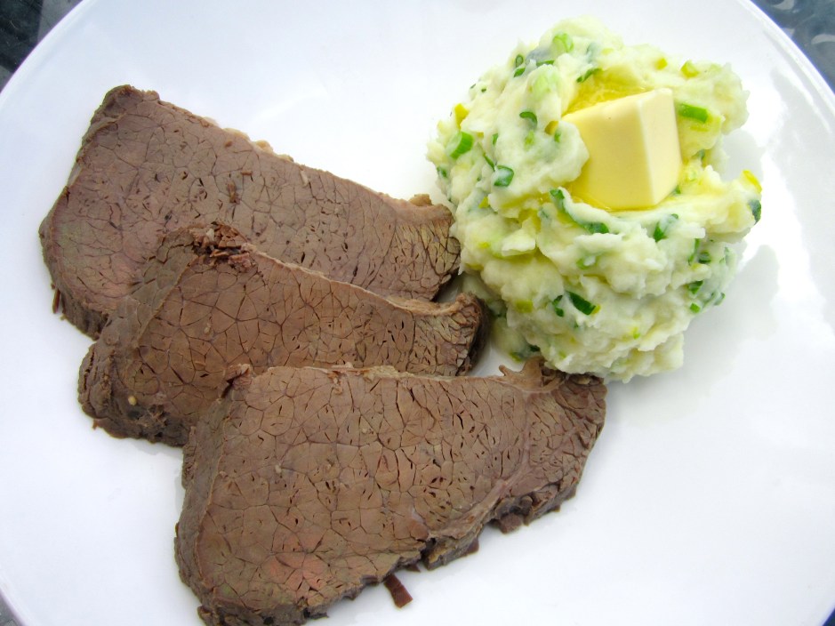 10 ← Previous Next → to serve, place a portion of potatoes on plate next to sliced corned beef, make an indention, place a generous knob of butter in indention