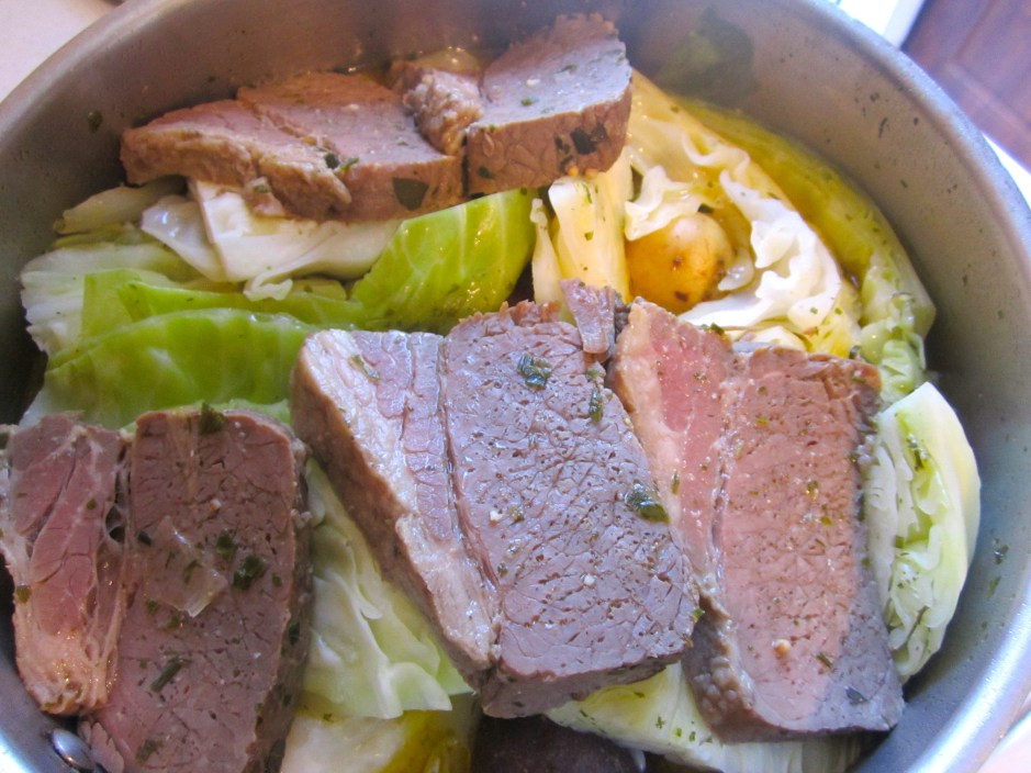 Corned Beef And Cabbage ← Previous Next → add corned beef, ladle butter/stock from the bottom of the pan over the meat and cabbage, cover, simmer until cabbage is done, about 15 to 25 minutes, depending on your preference of texture