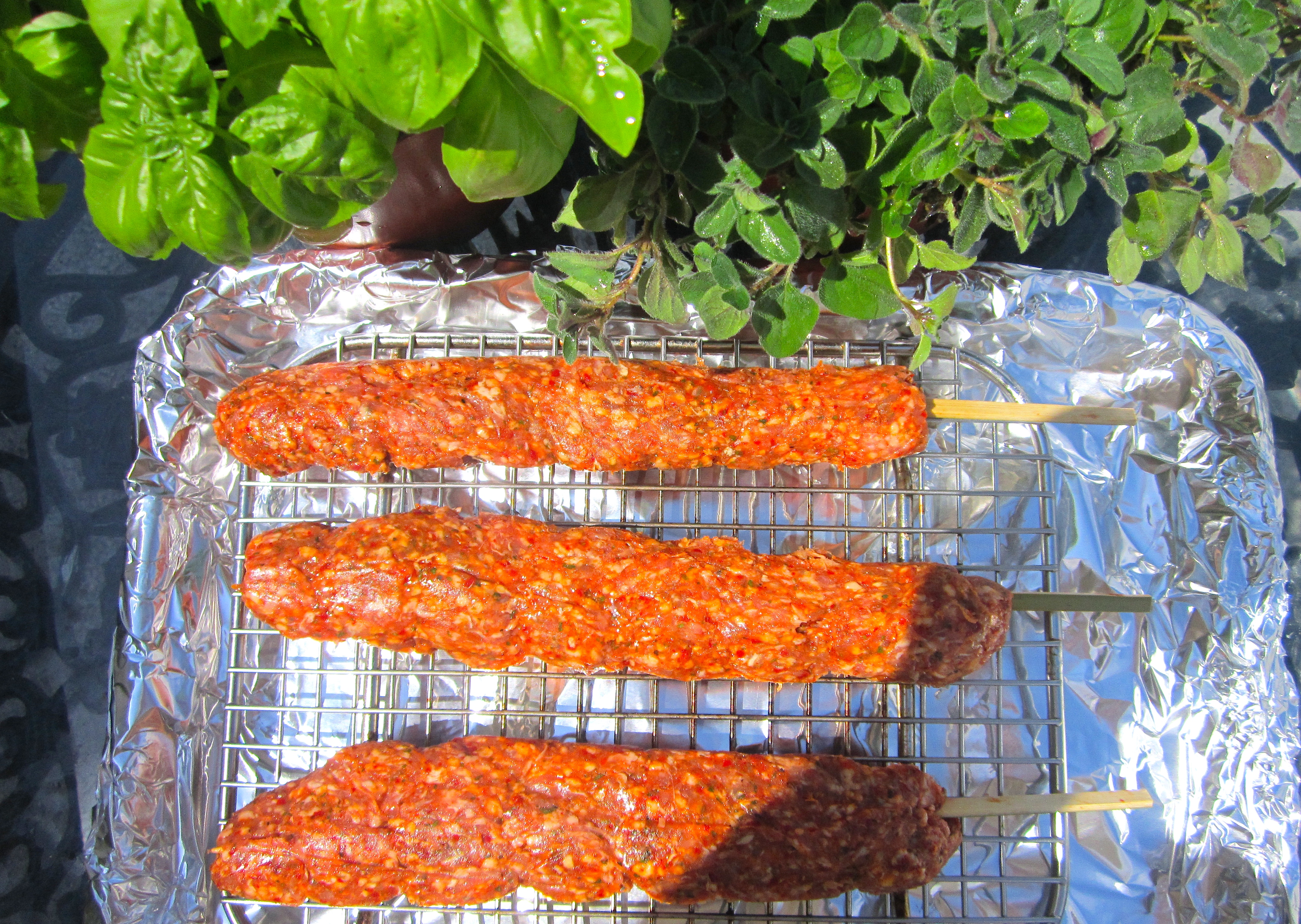 Turkish Adana Kebab Next → season ground lamb with sumac, cinnamon, cumin, paprika, grd coriander seeds, oregano, chili flakes, chopped onions, garlic paste, kosher salt, mix well, form into 8 oz balls, thread around skewers, grill until medium