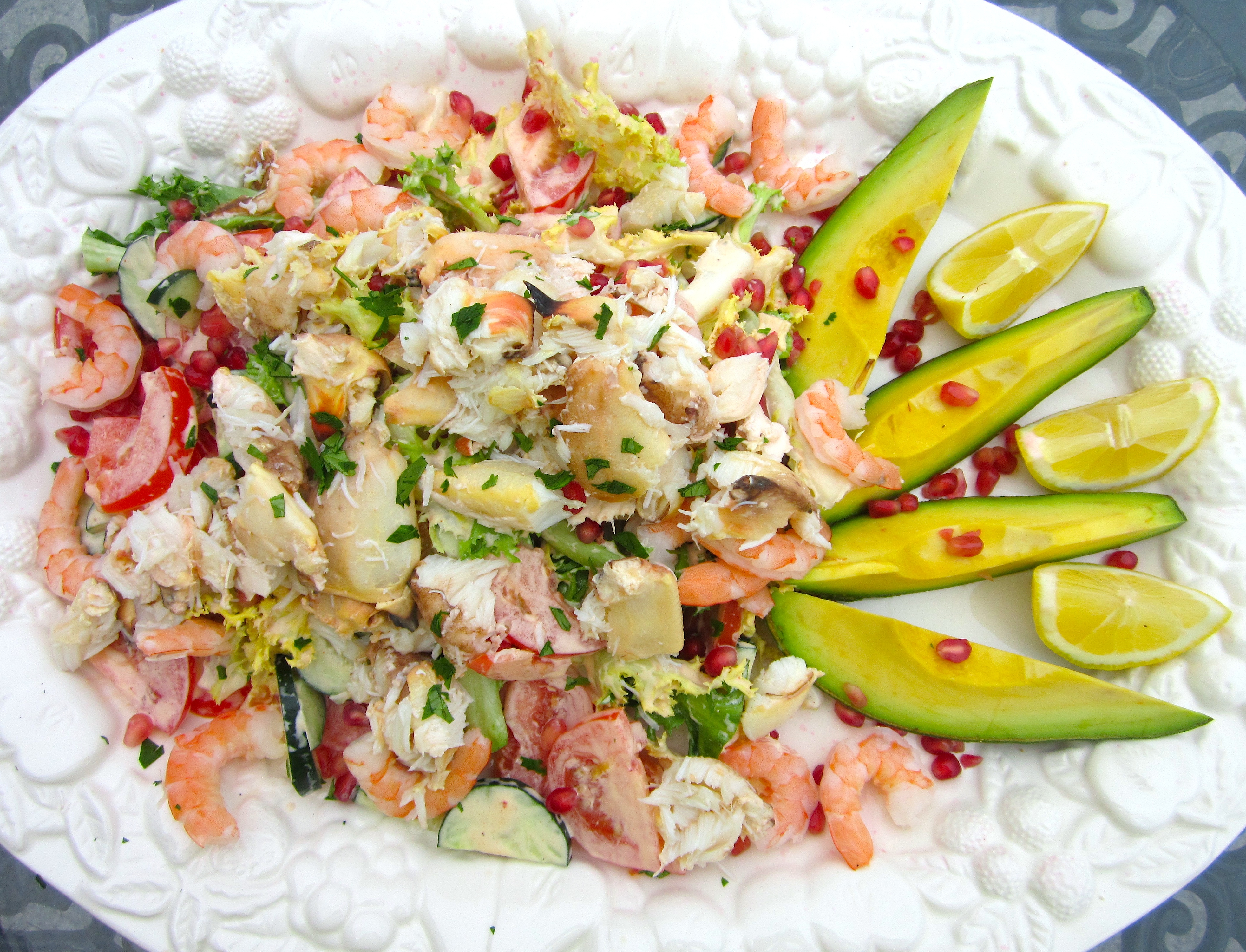 Crab And Shrimp Salad ← Previous Next → sprinkle salad with pomegranate seeds, top with crab meat and shrimp, drizzle with fresh lemon juice
