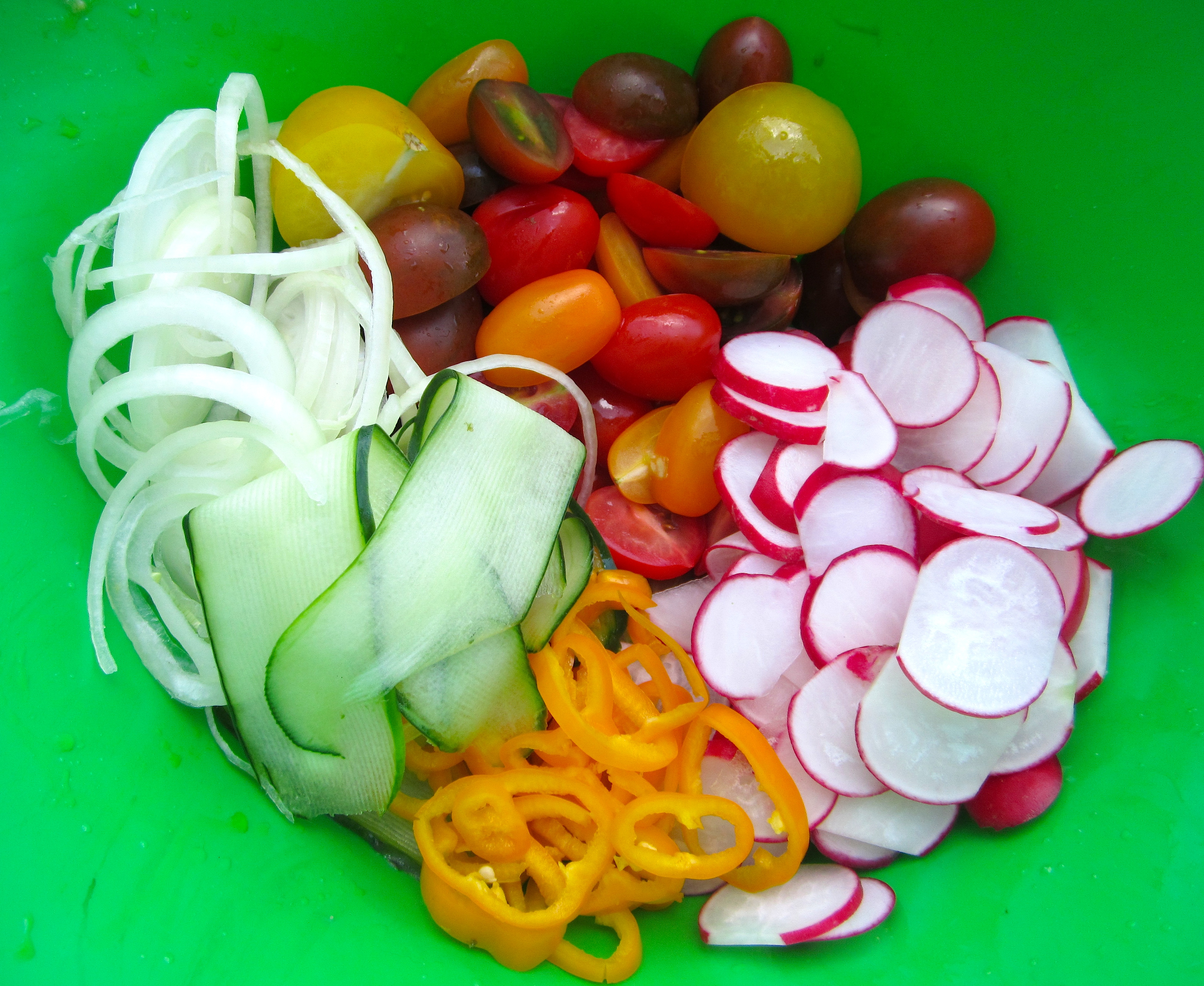 Salad And Irish Cheddar ← Previous Next → sliced cucumbers, onions, radish. mild chilies, halved rainbow tomatoes, dressed in honey/mustard vinaigrette