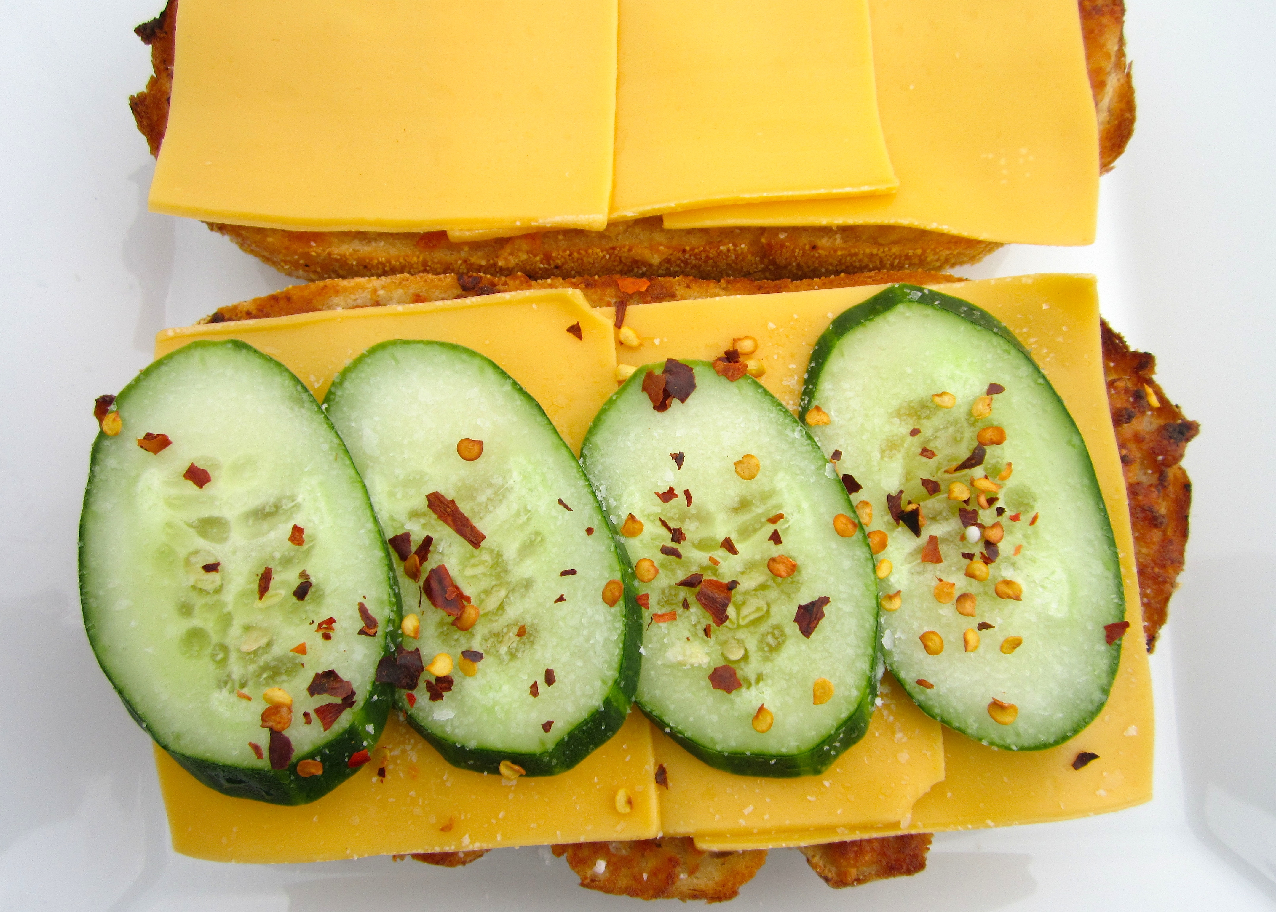 Bologna & Cheddar Sandwich – Boss Level ← Previous Next → top both slices of bread with sharp cheddar, then top one slice with sliced cucumbers , season with kosher salt and chili flakes