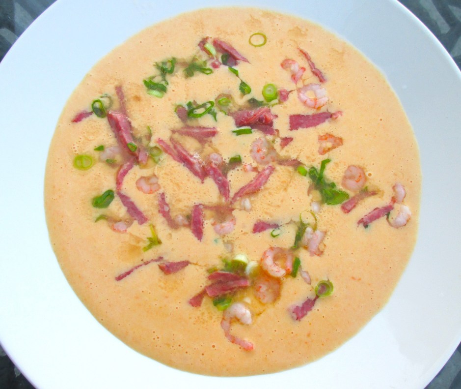 Creamy Potato And Carrot Soup With Salami And Shrimp ← Previous Next → ladle soup into serving bowl, top with shrimp/salami mixture