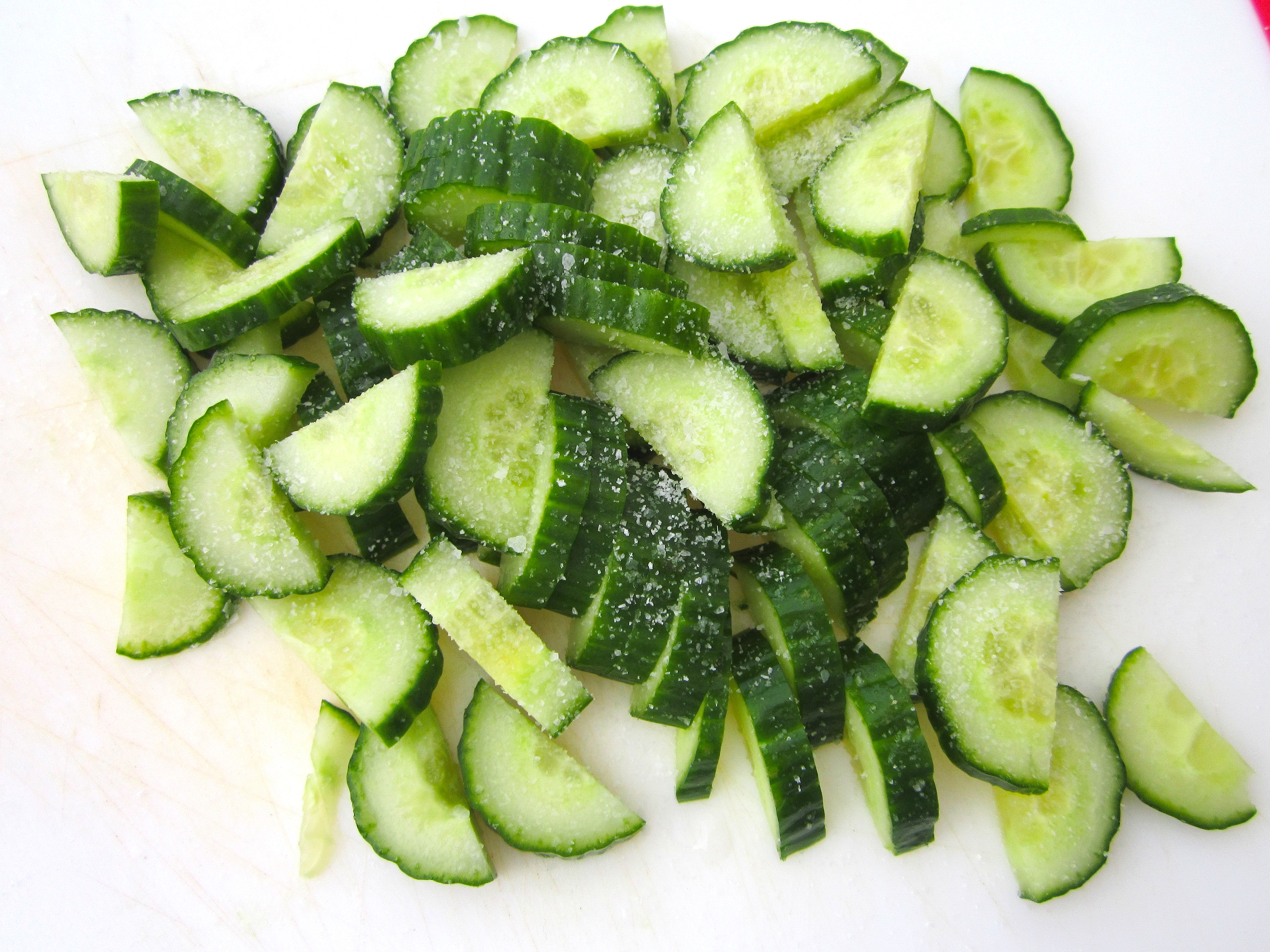 Slice and salt cucumbers, let rest for 20 minutes, squeeze out water
