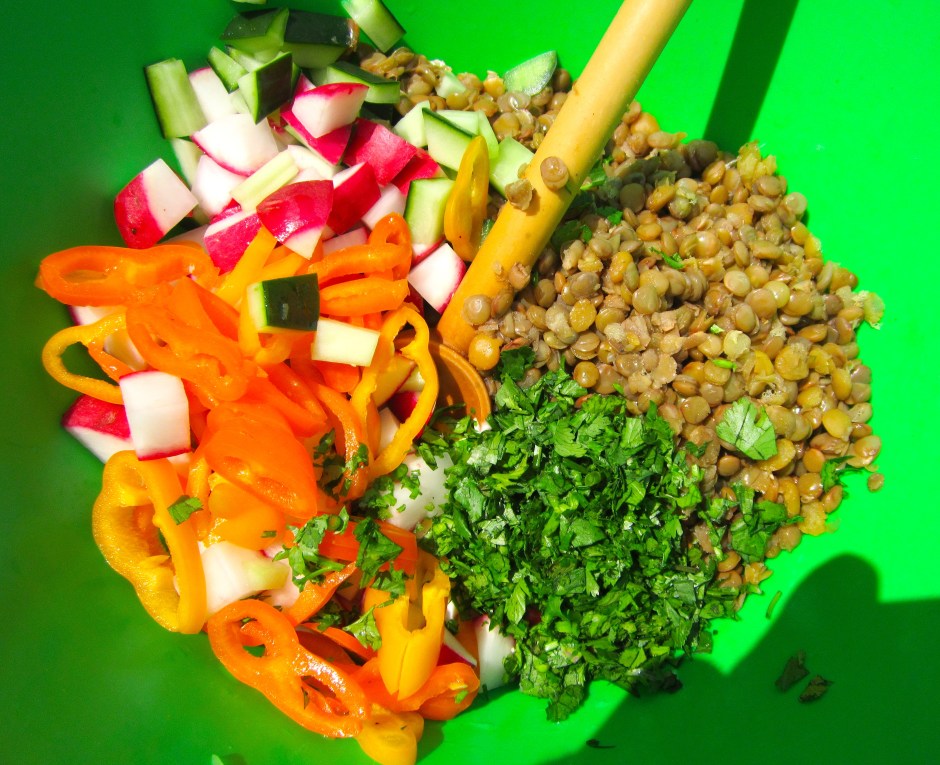 Tandoori Chicken Salad ← Previous Next → add lentils, chopped cilantro, diced radish, diced cucumbers and sliced chilies, mix well, check / adjust seasoning