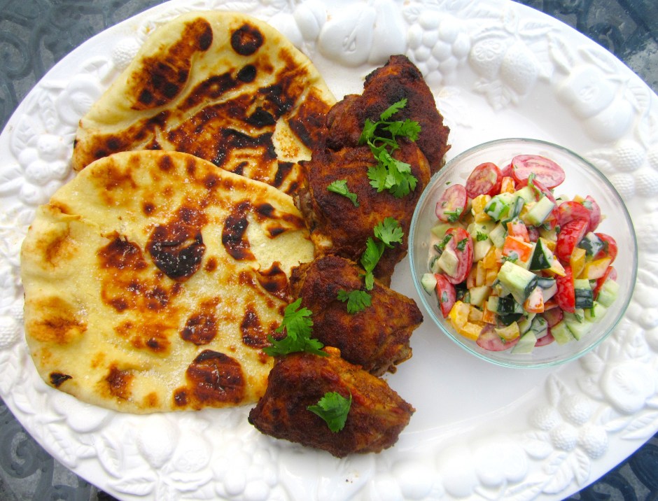 naan, tandoori chicken, tomato/cucumber/yogurt salad