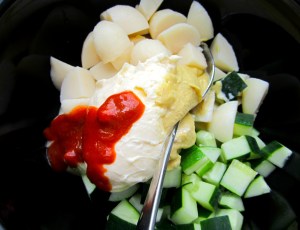 - diced cooked potatoes, diced cucumbers, mayo, dijon mustard, sriracha, garlic paste, kosher salt