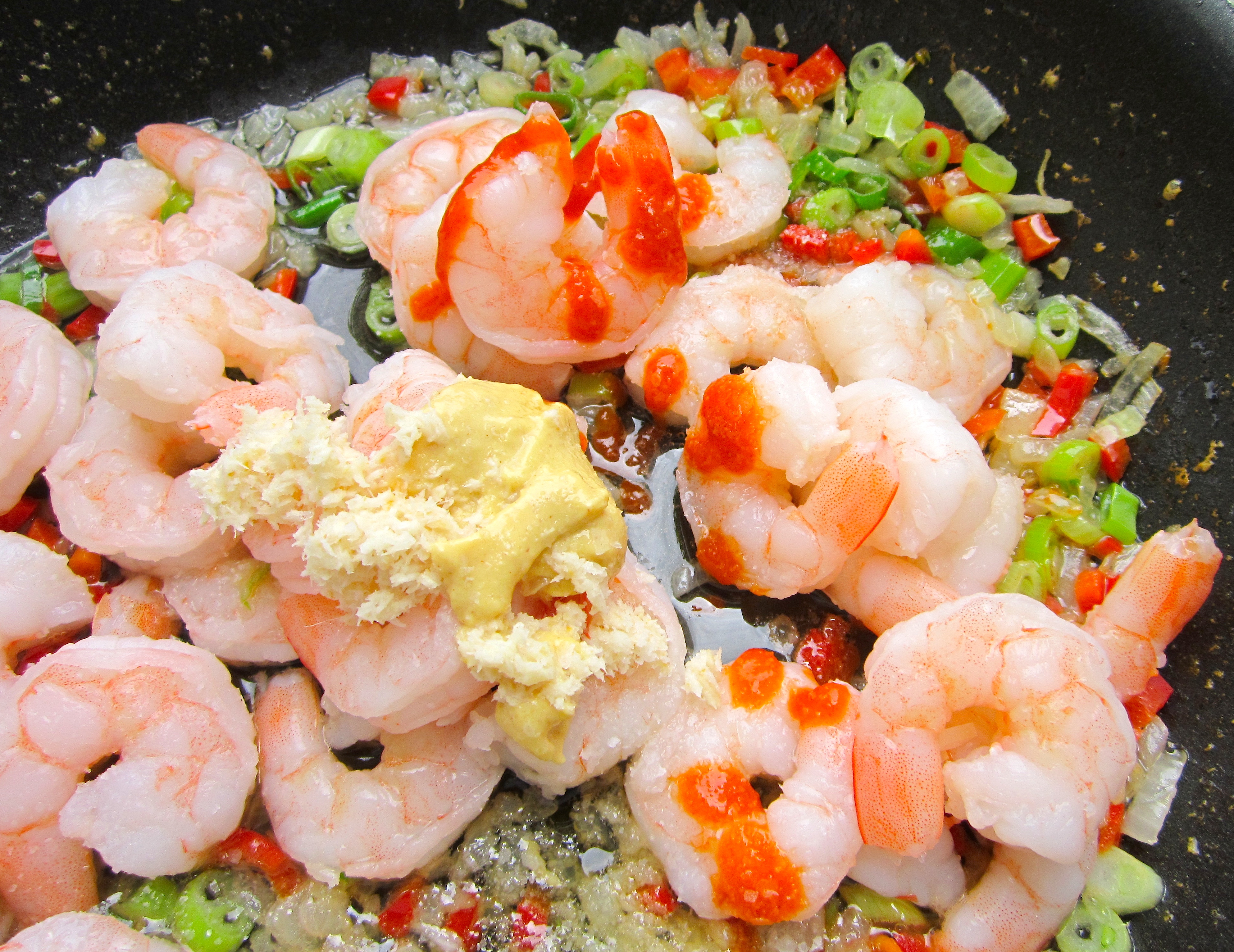 add shrimp, dijon mustard, horseradish, sriracha and kosher salt