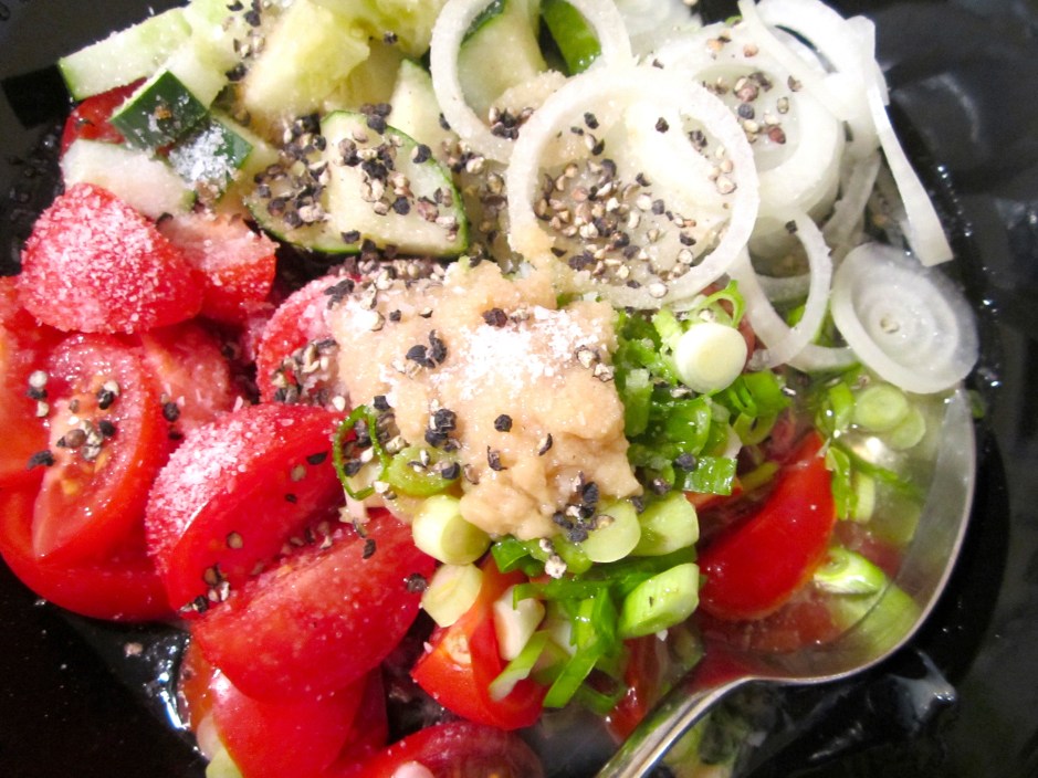Open Faced Octopus Salad Sandwich ← Previous Next → add tomatoes, onions, scallions, cucumbers, garlic paste, raspberry vinegar, kosher salt and fresh ground black pepper and a spritz of maggi seasoning