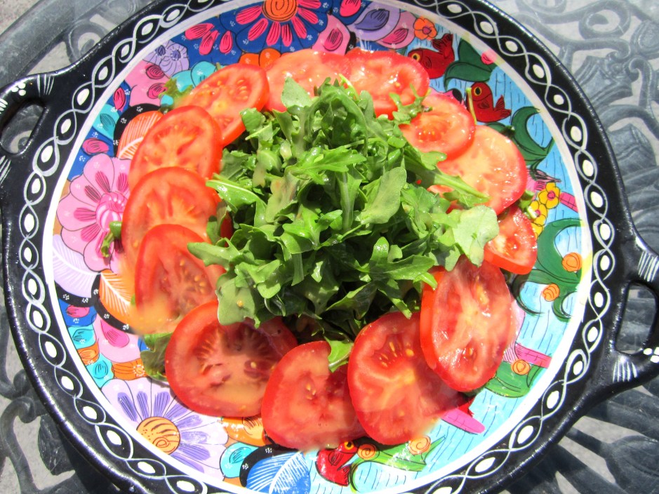 Summer Feast Salad Next → dress arugula and thinly sliced vine-ripened tomatoes with apple cider vinaigrette