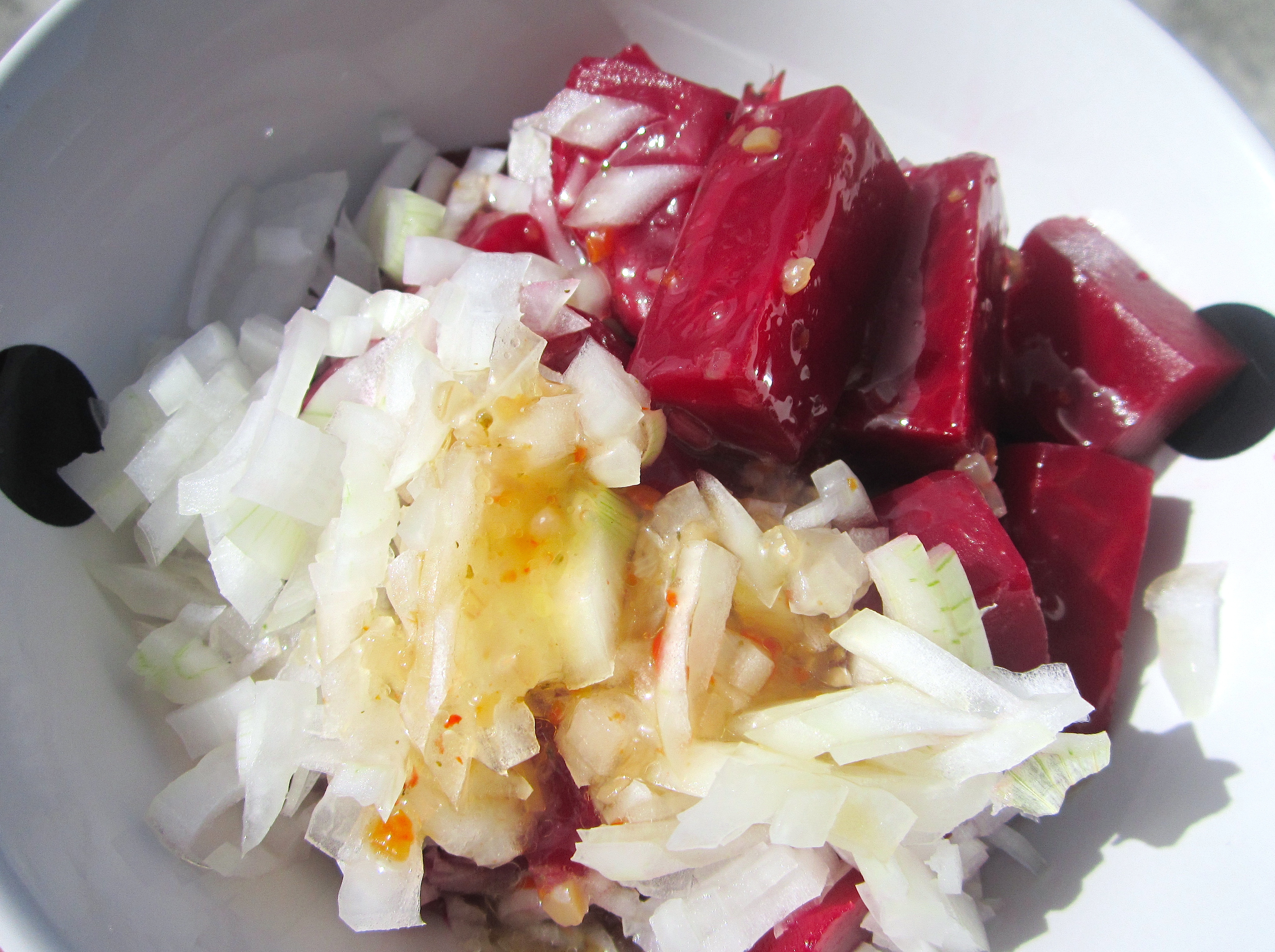 mix diced red beets (red rubies) with Italian vinaigrette and diced onions