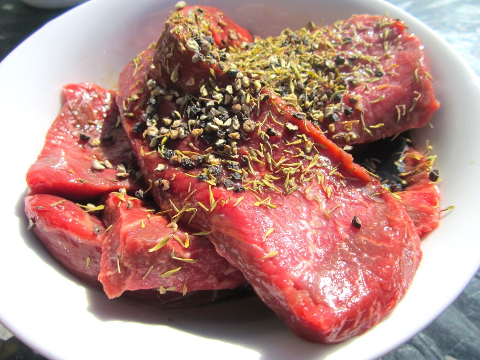 Steak Salad Sandwich Next → trim a 16 oz striploin of all fat, slice into 3 thin strips, marinade overnight in soy sauce, thyme, oregano, fresh ground black pepper and garlic oil