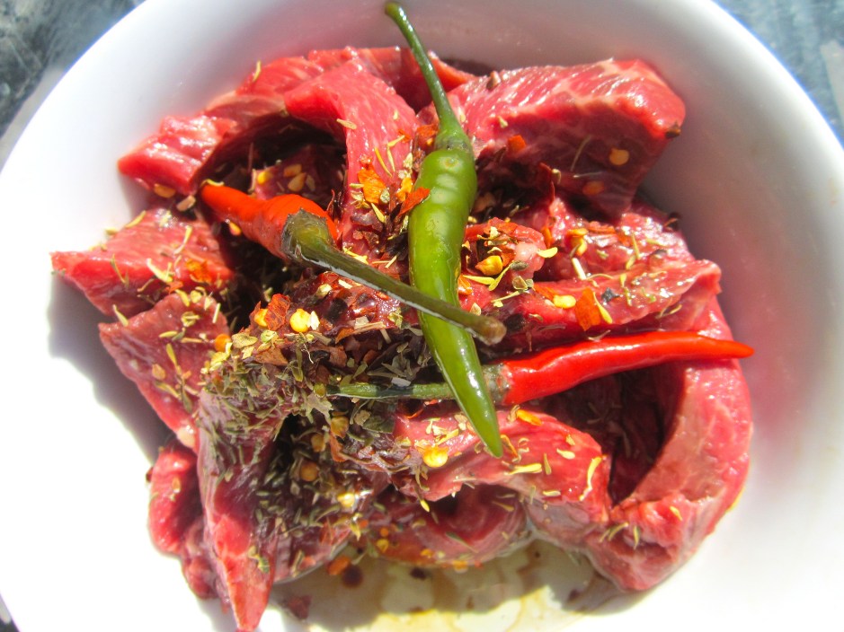 Udon With Tender Tips Next → slice tenderloin tips into batons, season with oregano, chili flakes, whole chilies,and soy sauce