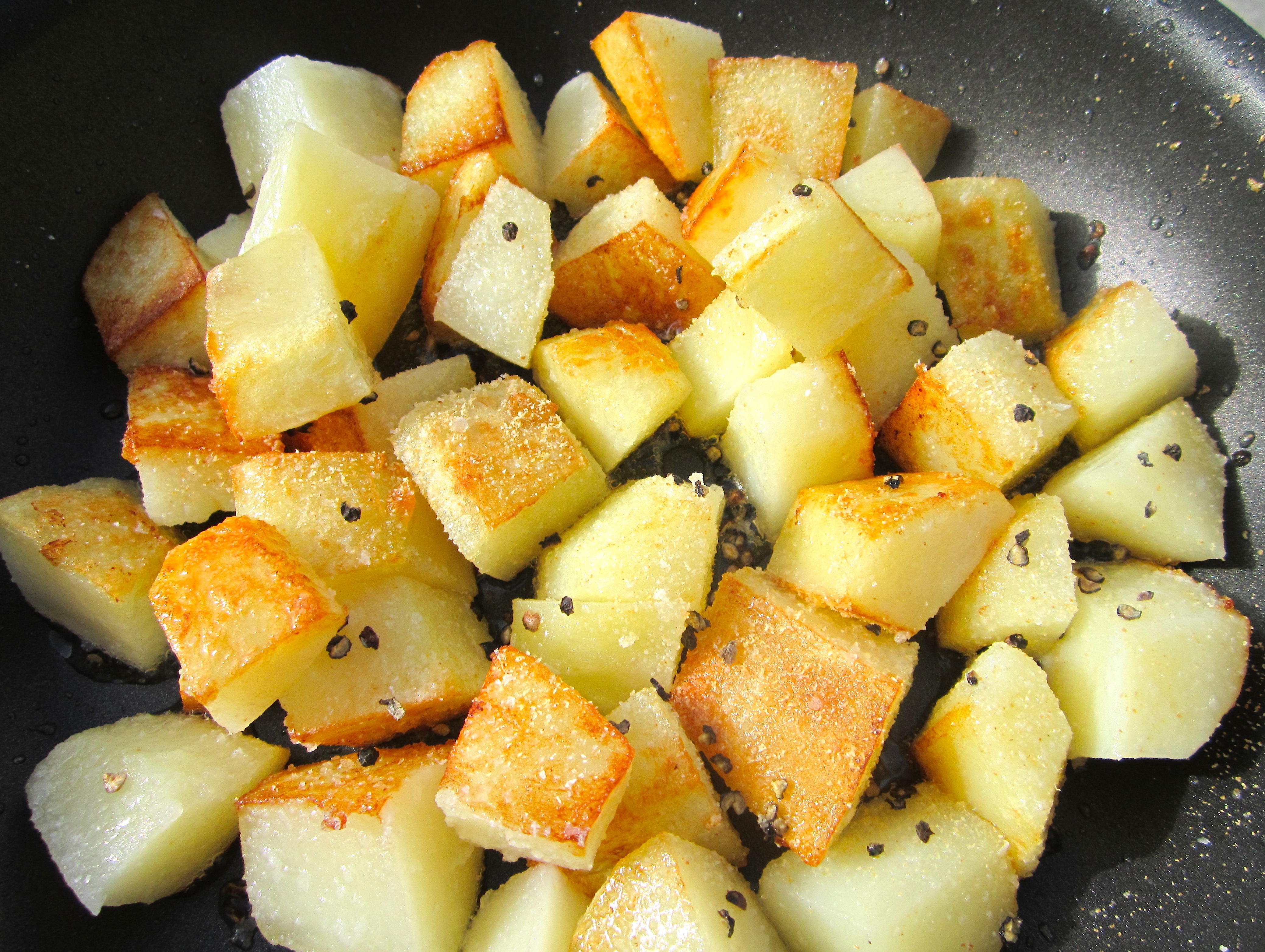 Tortilla Espagnola ← Previous Next → saute diced potatoes in olive oil, season with kosher salt and fresh ground black pepper