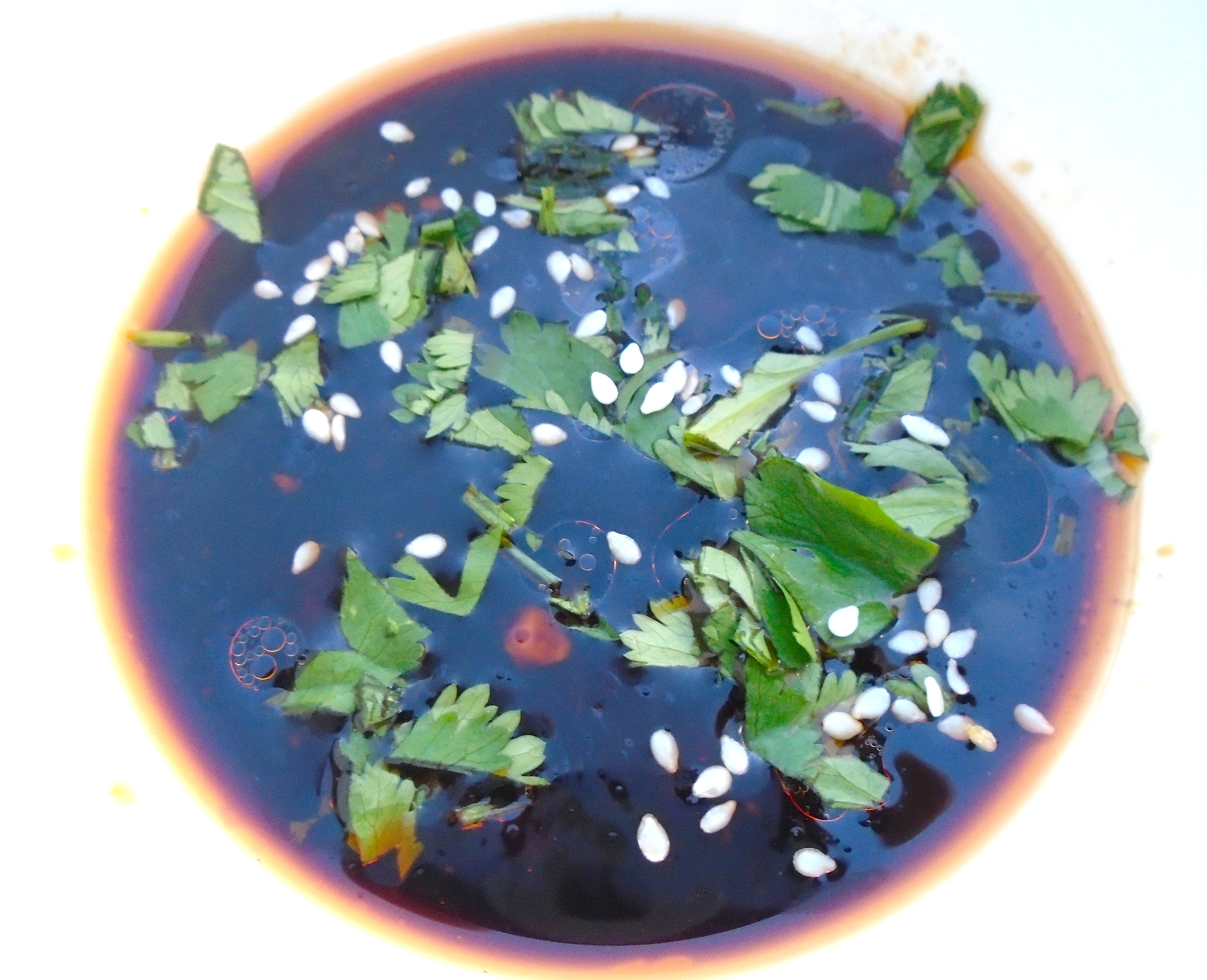 Fried Tomato-Noodles Pillow ← Previous Next → dipping sauce: mix 2 tblsp soy sauce, 2 tblsp hoi sin sauce, 2 tblsp water, 1 tblsp ketchup, 1 tsp lime juice, season with grated ginger, garlic paste, sesame oil and chili oil, to serve, sprinkle with chopped cilantro and sesame seeds