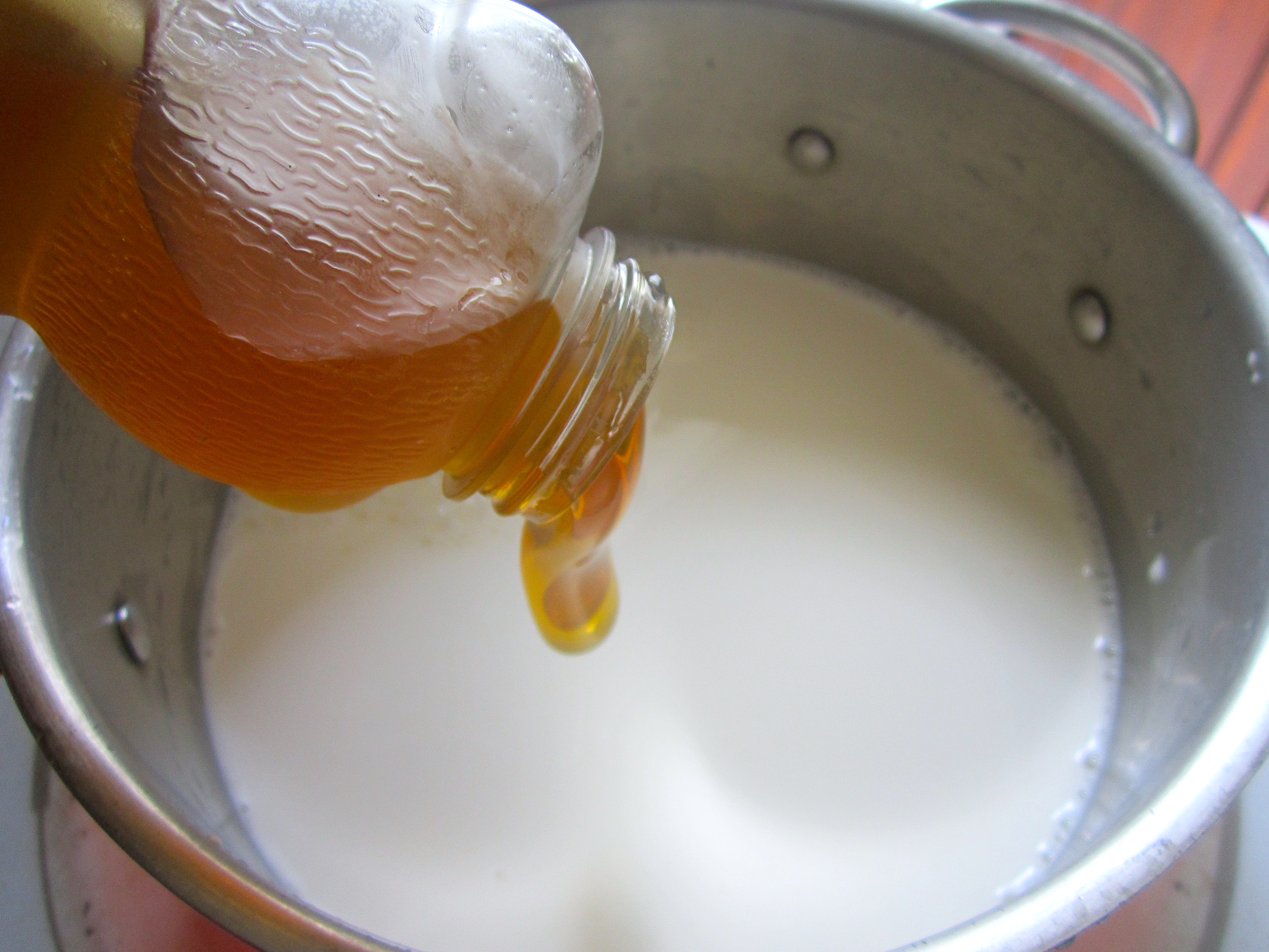 Panna Cotta Next → Sweeten 6 cup heavy cream and 3 cup half&half with 1/2 cup of honey, add a few drops of organic vanilla extract, bring to a simmer, remove from heat