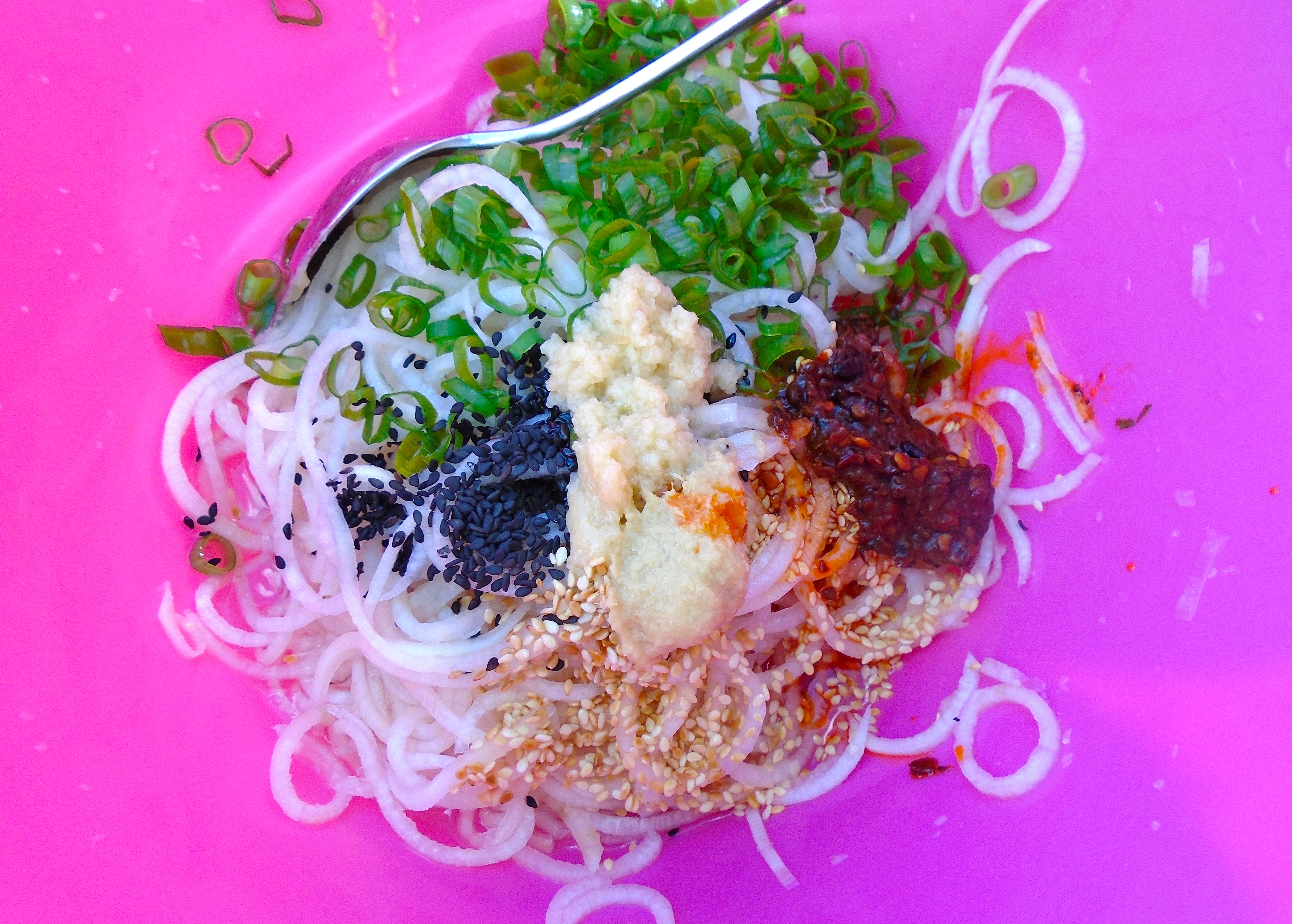 Musaengchae ← Previous Next → add black sesame seeds, white toasted sesame seeds, gochujang, garlic paste, ginger paste, white vinegar and scallions, mix carefully in order to not break-up the radish julienne
