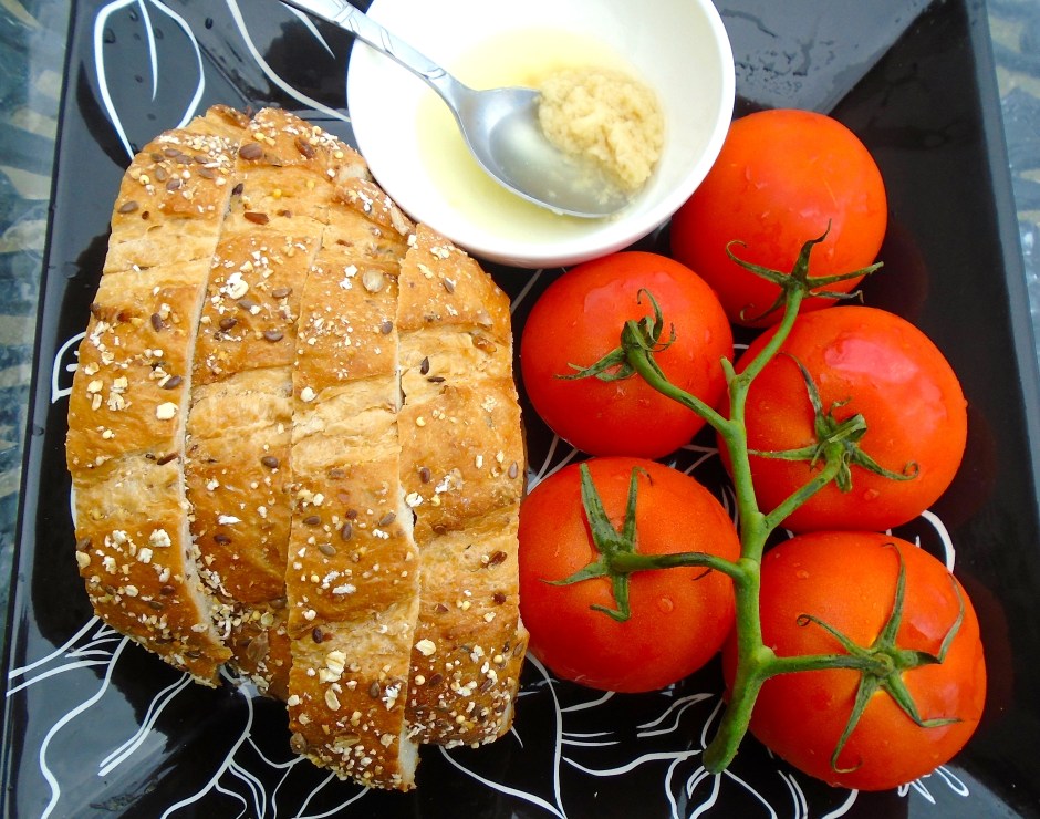 sour dough bread, vine-ripened tomatoes, garlic-confit paste in olive oil