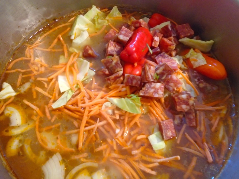 Executioners Stew ← Previous Next → add chillies, carrot julienne, white cabbage and chorizo, simmer for three more minutes