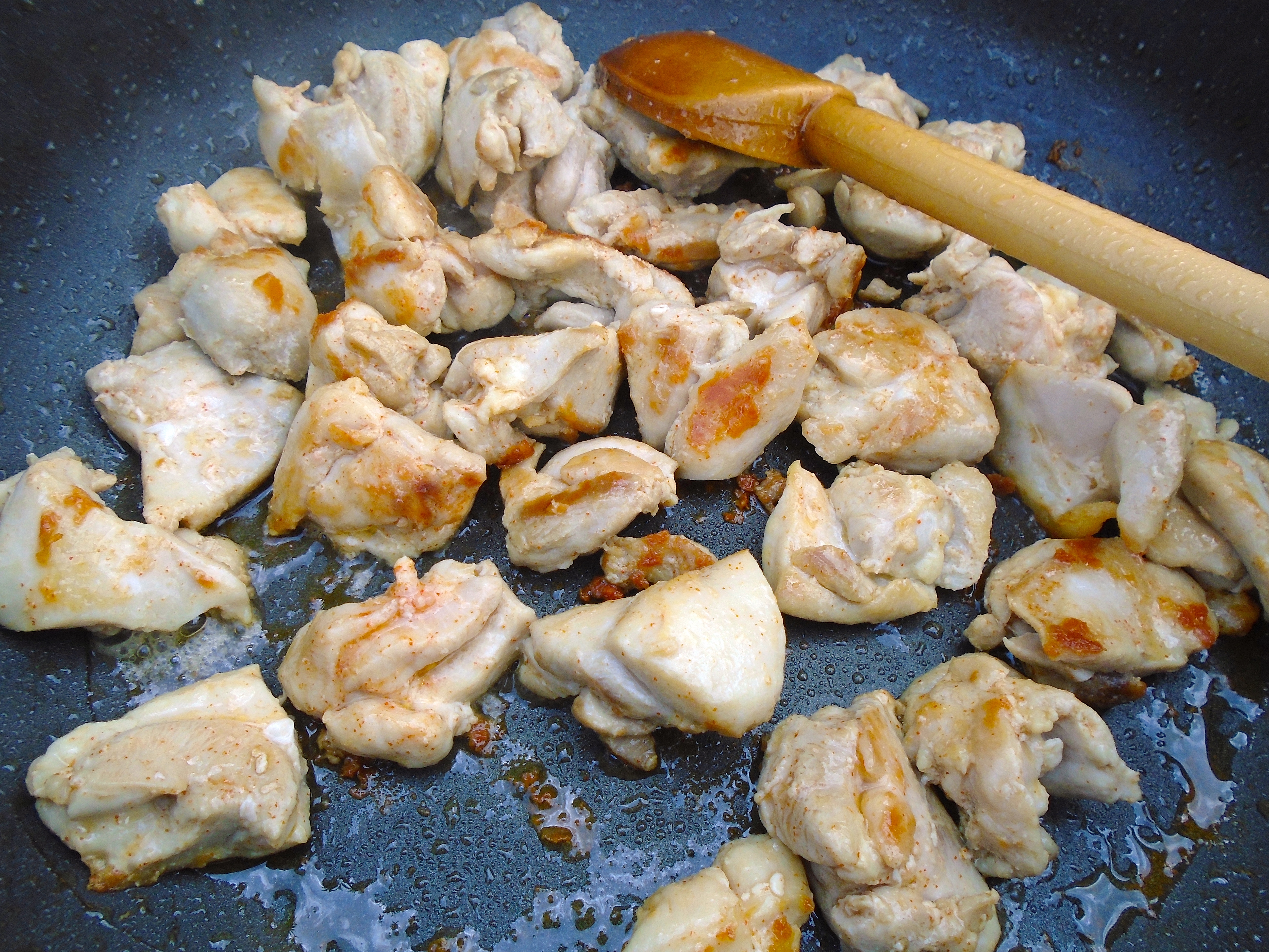 Chicken-Noodle Soup With Spicy Sausage And Napa Cabbage Next → saute diced chicken in garlic oil until lightly browned