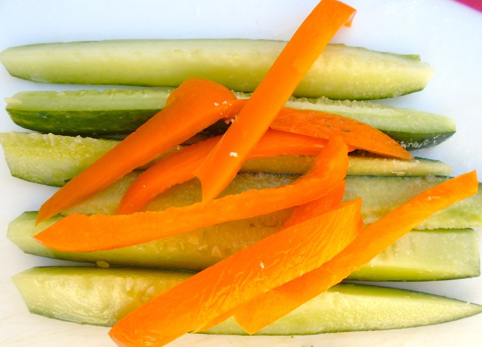Spinach Wrap With Curried Garbanzos And Shrimp ← Previous Next → cut bell peppers and cucumbers into batons, season with lime juice, kosher salt and cayenne pepper, let marinade for 15 minutes
