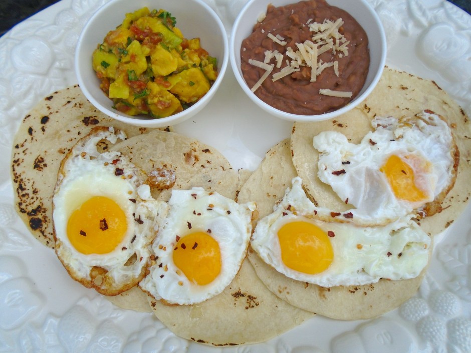 plate tortillas, top with eggs, sprinkle with chili flakes